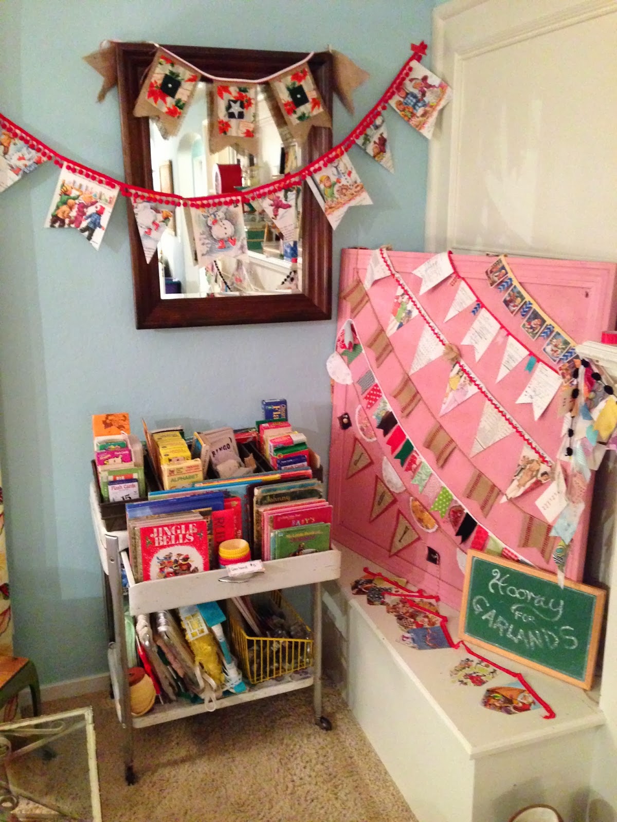 Look at some of these fun Garlands! We used Christmas books, sheet music, scrapbook papers, flash cards, bingo cards and fabric!